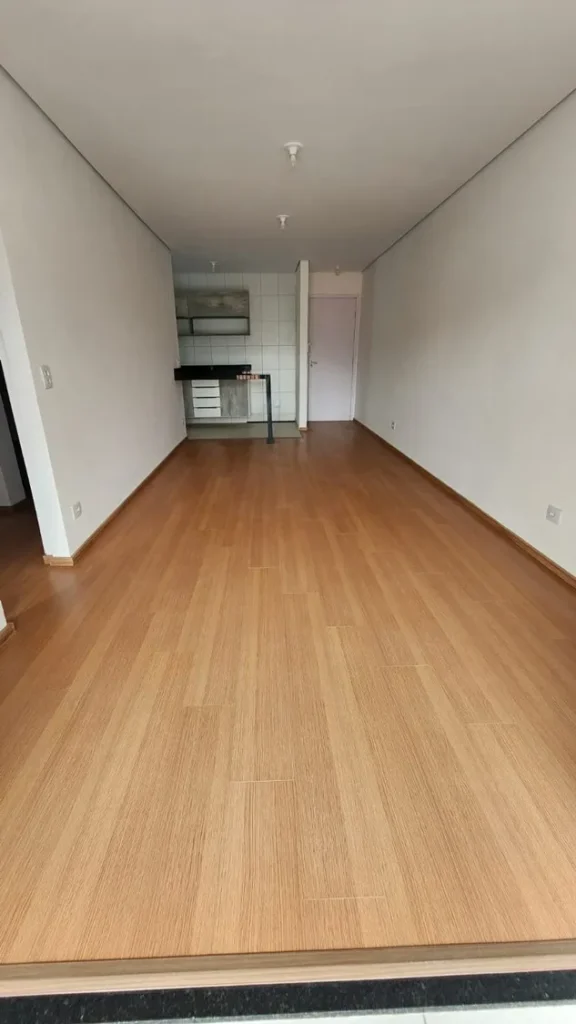 O piso vinílico foi escolhido pela praticidade e conforto térmico, garantindo unidade visual em todo o apartamento. A marcenaria sob medida deu o toque final: armários planejados na cozinha, dormitório e área de serviço, otimizando cada centímetro e mantendo o ambiente leve e elegante. Tons neutros, iluminação em trilho e acabamentos em madeira natural completaram a composição.